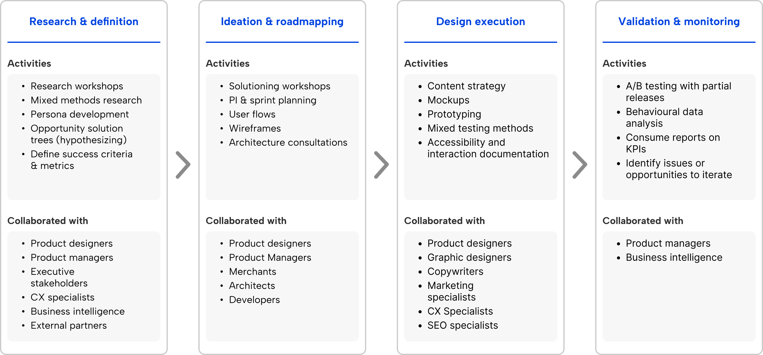 As Product Design Manager, I led a team of six designersand collaborated closely with partners across the organization. Working closely with my product counterpart, I grounded our strategy in customer research, data, and business goals. I crafted an experience vision with clear UX outcomes that informed our product portfolios. Each portfolio delivered multiple experiments that were A/B tested to prove their value before full rollout and were continuously monitored to fuel ongoing iterations during subsequent program increments.
