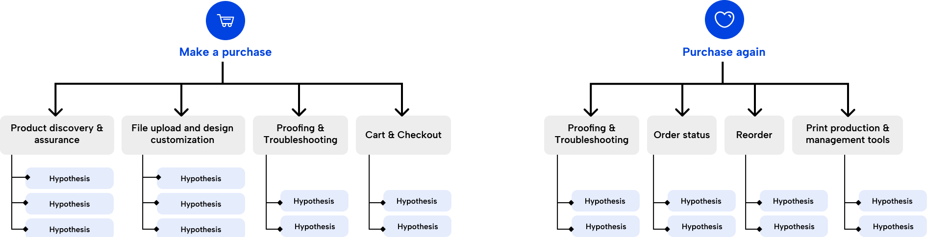 My product counterpart provided clarity about our two key business outcomes. While they were measured through several KPIs, every initiative ultimately aimed to increase the percentage of customers who made a purchase—or made one again.